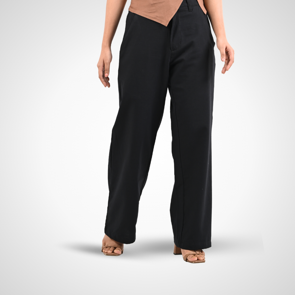 Minimal straight-cut pant with a subtle bell-bottom flair and sleek matte black...