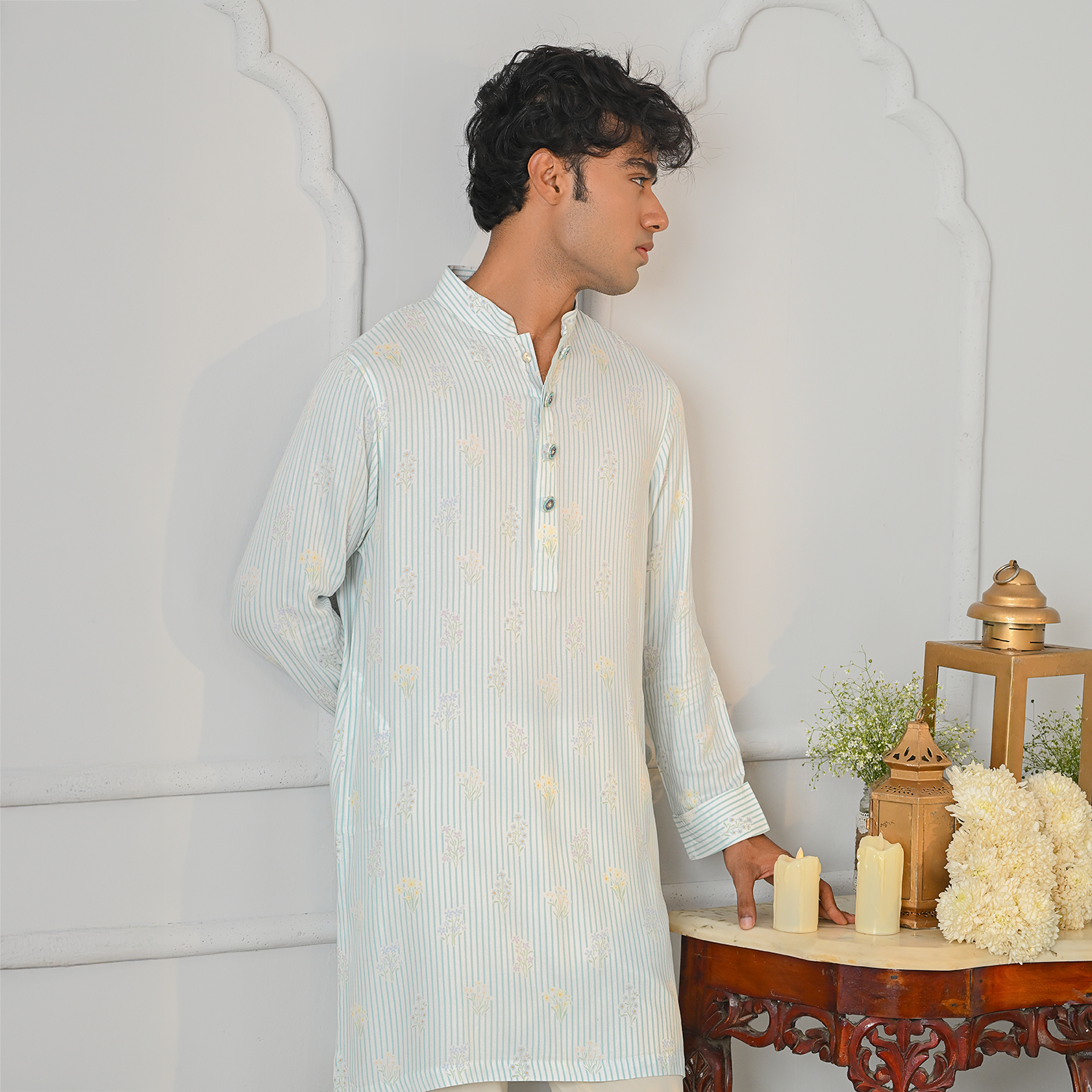 Introducing our Gulbahar Series, designed to reflect grace, freshness, and festive sophistication. This Pastel Blue Panjabi is crafted from premium cotton viscose fabric, featuring delicate striped floral and bird-inspired patterns, enhanced with fine handcrafted detailing on the show button. A perfect blend of comfort, elegance, and contemporary ethnic style.