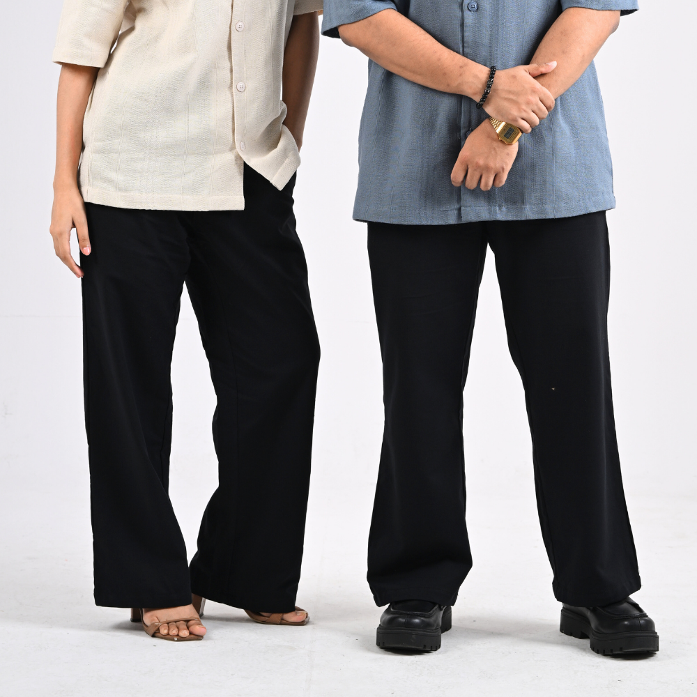 Minimal yet trendy, this straight-cut pant features a subtle bell-bottom silhouette for an elevated everyday style. The sleek matte black finish makes it versatile for both casual and semi-formal looks.